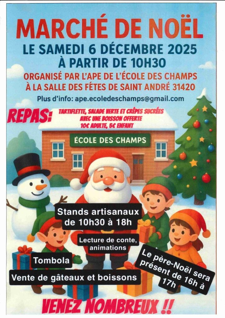 Le marché de Noël 2025 aura lieu le samedi 6 décembre 2025 à la Salle des Fêtes L’APE, association de…