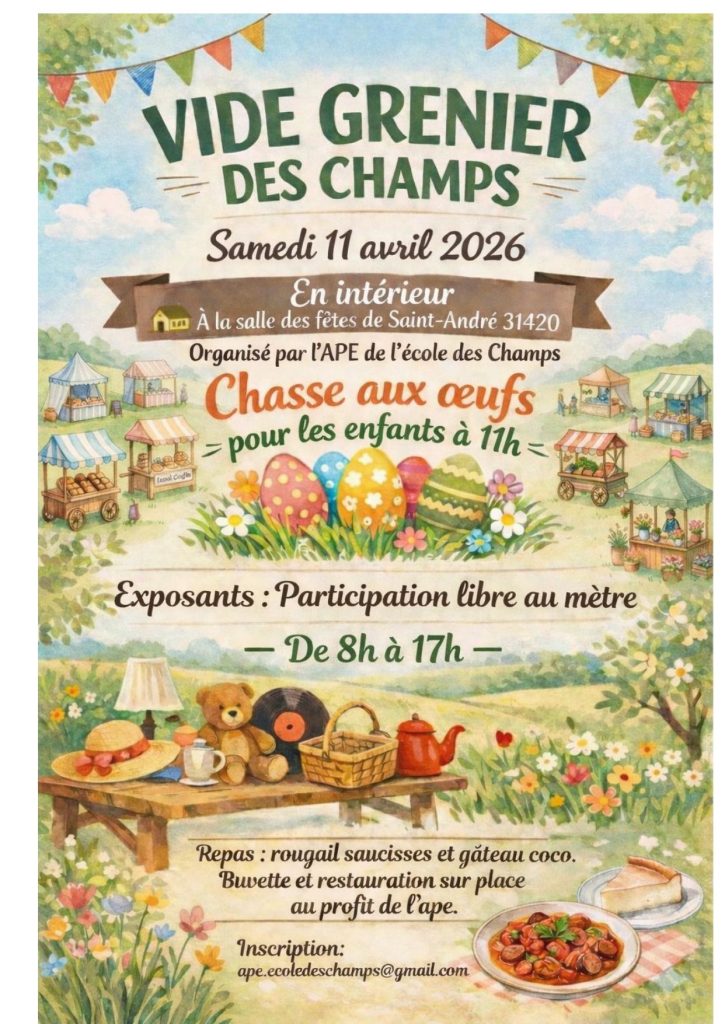 L’APE, Association des Parents d’Elèves, organise un Vide Grenier Participation Réservation obligatoire par mail à l’adresse suivante ape.ecoledeschamps@gmail.com Date limite…
