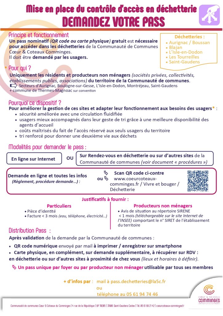 La communauté des communes Coeur Coteaux et Comminges met en place un nouveau système Le PASS ACCES DECHETTERIE Ce pass…